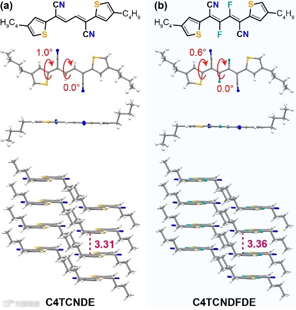 为了进一步了解该类缺电子结构单元的几何结构及其聚合物的堆积状态,作者还合成两个模型分子C4TCNDE和C4TCNDFDE,并培养、解析了它们的单晶结构。从图3可以看出,丁二烯类缺电子结构单元不但具有高度的平面性,而且具有小的位阻效应,因此整个模型分子呈现出了优异的平面性;另外模型分子的堆积比较紧密,相邻分子间的π-π堆积距离为3.31 and 3.36 Å,这有利于载流子在分子间的传输。