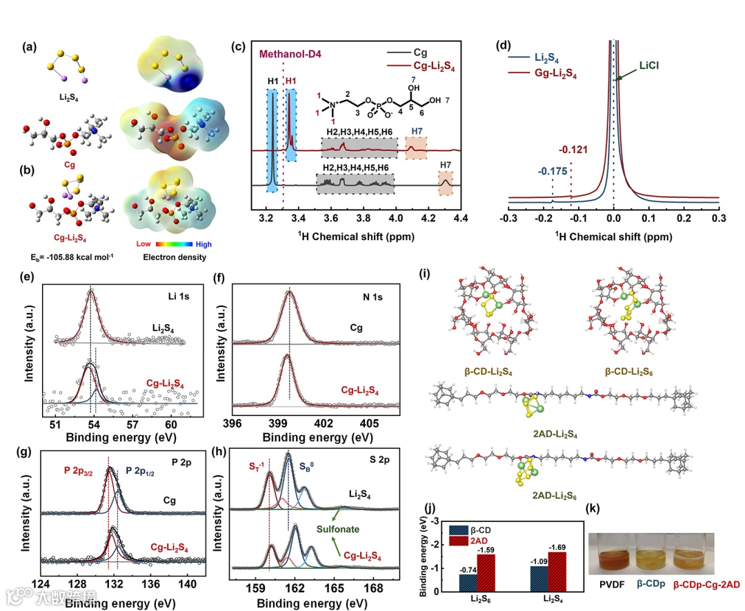 图2 (a)Li2S4和Cg的静电势分布;(b) 复合物的稳定构型和结合能;(c)1H NMR谱图;(d)7Li NMR谱图;(e-h) Li 1s、N 1s、P 2p和S 2p XPS分峰谱图;(i)理论吸附模型和(j)吸附能;(k) PVDF、β-CDp和 β-CDp-Cg-2AD粘结剂静态吸附后Li2S6溶液的光学照片。