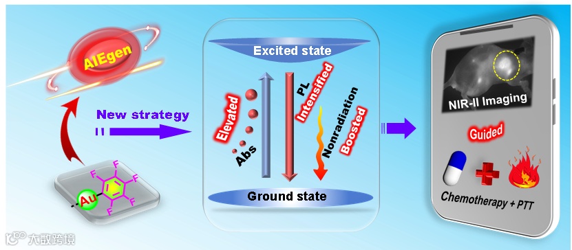 癌症已成为严重危害人类健康的重大公共卫生问题。目前,在癌症诊断和治疗方面,仍然面临巨大挑战。荧光成像(FLI)技术作为一种新兴的成像方式,由于其操作简单、灵敏度高等优点,在临床诊断中显示出巨大的应用前景。具有长波发射的近红外二区(NIR-II)材料可实现深层组织穿透、高空间分辨率及高信噪比的荧光成像。然而,这些NIR-II发光系统通常需要引入大而复杂的π共轭骨架来延长吸收及发射波长,合成难度高且易引起聚集引起的淬灭(ACQ)现象。相比之下,具有聚集诱导发光(aggregation-induced emission, AIE)特性的供体-受体(D-A)型扭曲结构的体系不仅可以拓宽吸收和发射,还能获得高效的发光,以实现深部、高空间分辨率的荧光成像。遗憾的是,由于AIE体系通常以扭曲的结构存在,且包含诸多转子,导致其吸收率较低,进而制约了其发光效率和依赖非辐射衰减途径的光疗效果。因此,迫切需要开发一种新的策略来解决AIEgens低吸收率的问题,这也是目前新材料开发中普遍存在的挑战。