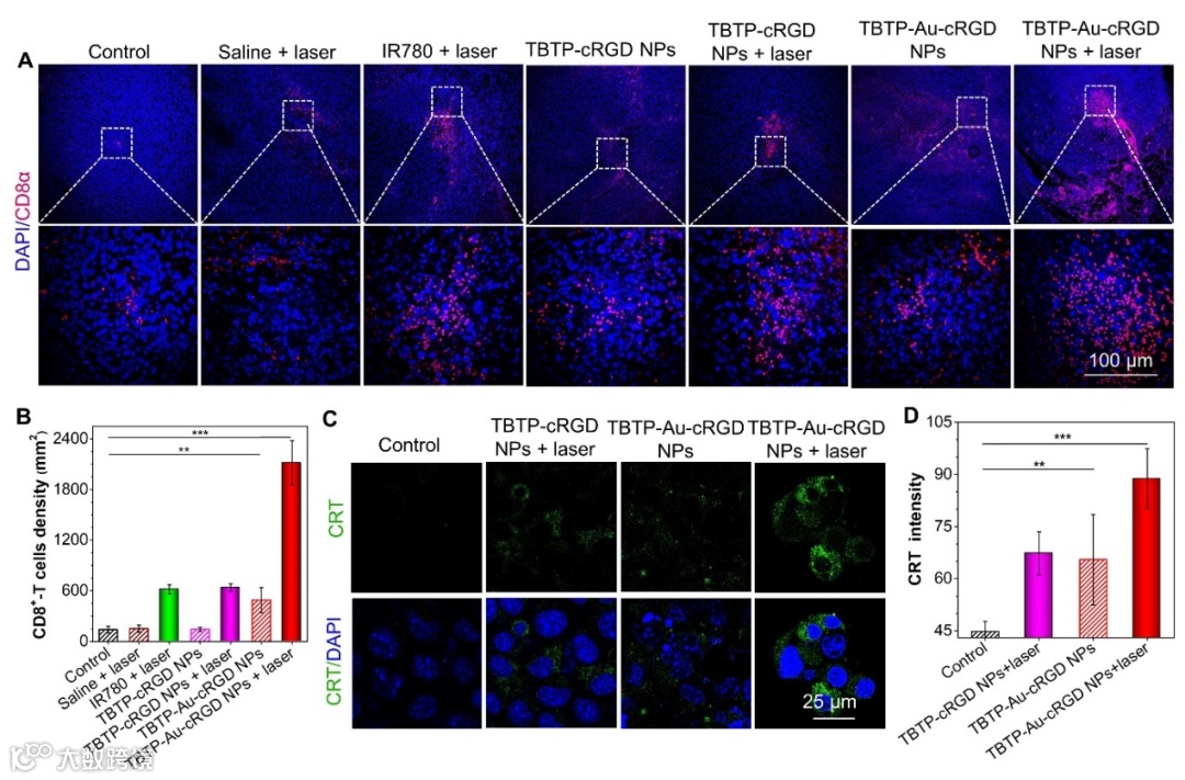 (5)理想的癌症治疗不仅要根除原发性肿瘤,还要通过激活免疫系统诱导系统性抗肿瘤免疫,以控制转移性肿瘤,防止肿瘤复发。评估了不同组肿瘤组织切片中免疫细胞的百分比以及细胞水平免疫原性死亡的标志物(图7)。结果表明,TBTP-Au-cRGD NPs诱导的化疗和PTT协同治疗触发了小鼠的免疫反应,巩固了TBTP-Au cRGD NP的高效抗癌作用。