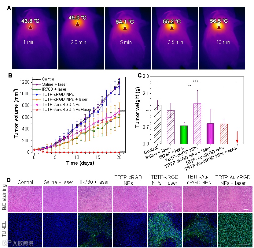 (4)进一步体内实验也证明了TBTP Au-cRGD NPs通过化疗协同PTT发挥高效的抗癌作用(图6)。使用4T1荷瘤小鼠进行抑瘤实验,尾静脉注射TBTP Au cRGD NPs后,随着照射时间的延长,肿瘤部位的温度从37°C升高到56°C,表明TBTP Au-cRGD NPs可以有效地在肿瘤部位积聚,并产生肿瘤热疗所需的足够热量,化疗和PTT的协同作用起到完全消融肿瘤的作用。