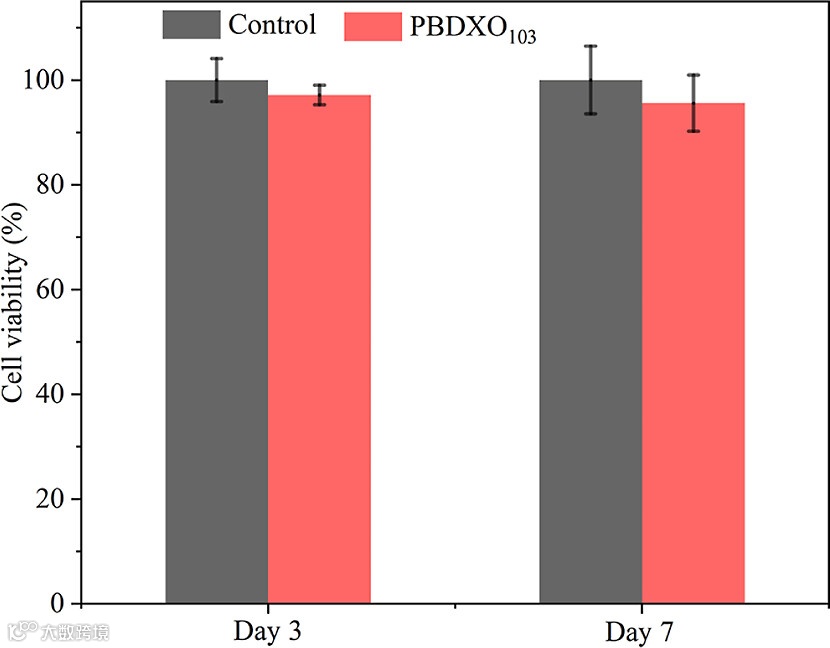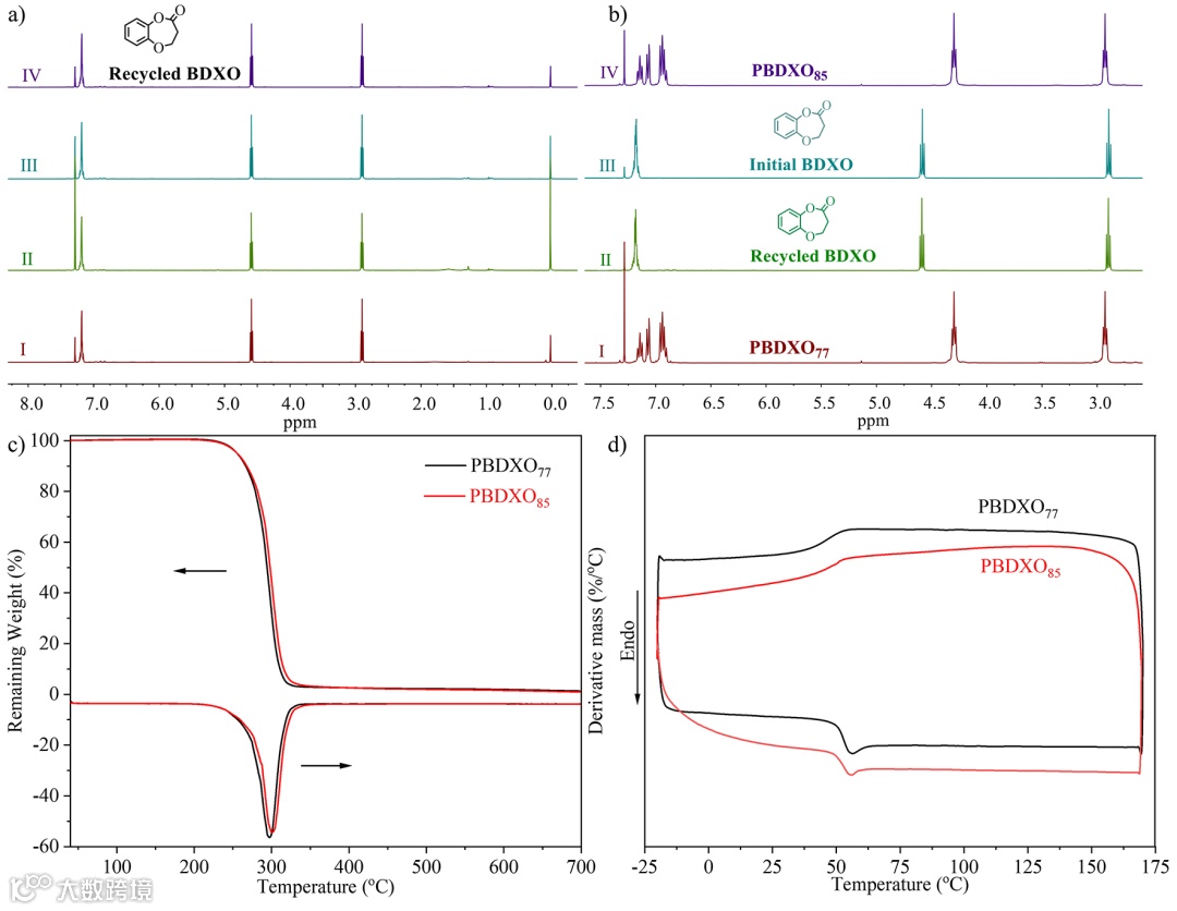 ,−30.90 J·mol−1·K−1),并计算出溶液中的聚合上限温度(Tc,196.8 °C)。制备的聚合物PBDXO不仅热性能优异、力学性能良好、可生物相容、可水解降解,而且可通过本体热解聚高效地回收BDXO单体,回收单体产率大于92%、纯度达到96%。进一步,回收单体BDXO可在相同条件下再次开环聚合,得到与初始PBDXO结构和性能几乎一致的再生PBDXO,从而建立了“单体BDXO↔聚合物PBDXO”的反复化学循环。