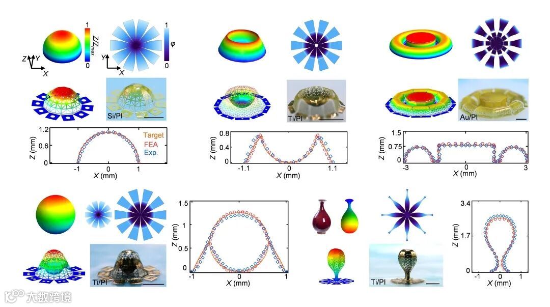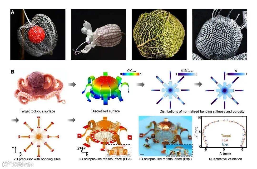 三维多孔微结构在生物体中广泛存在,它们在生物曲面的成型、营养物质的合成与输运、植物生长等方面发挥着多样的、不可替代的作用。由于多孔结构具有轻质高强、高比表面积、优异热学性能等优势,仿生多孔设计在新型材料和器件系统的研制中已得到广泛应用,包括高比刚度/比强度的点阵/泡沫材料,人造组织/器官中的分层血管网络和电磁超材料等。然而,利用仿生多孔微结构来调控三维曲面几何形状方面的研究仍为空白。从应用需求出发,制造具有可定制几何形状的微尺度三维曲面结构及器件,在生物电子学、微型机器人、微纳光学等领域有着重要的应用价值。