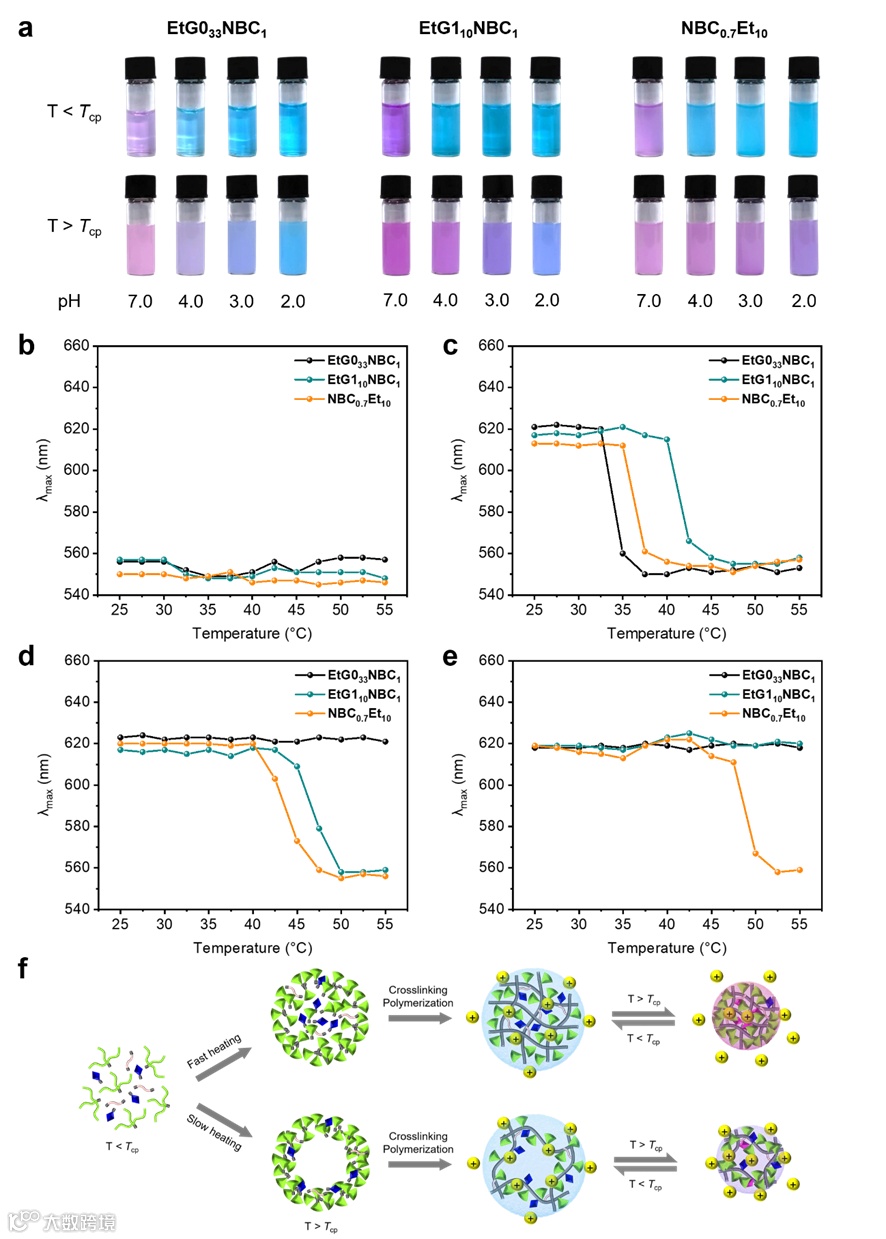 图6、温度响应型共聚物和微凝胶由温度诱导脱水和塌陷形成的受限微环境。NBC0.7Et10,EtG110NBC1和EtG033NBC1水溶液在不同pH条件下(pH 7.0、pH 4.0、pH 3.0和pH 2.0)低于Tcp和高于Tcp的照片(a),以及NBC0.7Et10,EtG110NBC1和EtG033NBC1水溶液在pH 7.0(b)、4.0(c)、3.0(d)和2.0(e)下的最大吸收波长随温度的变化曲线。温度诱导微凝胶内部染料质子化示意图(f)。