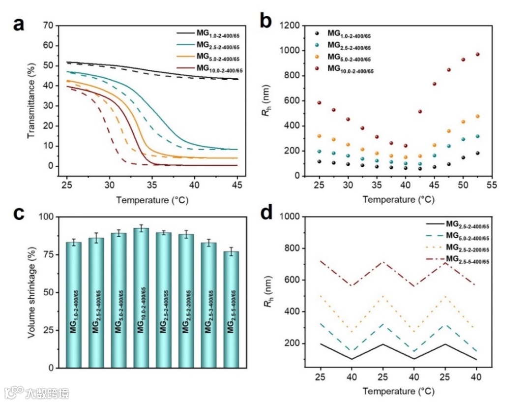 图5、微凝胶的温度响应性。(a)不同单体浓度制备的微凝胶透光率随温度的变化曲线。(b)不同温度下微凝胶的Rh。(c)微凝胶在高温下的体积收缩率。(d)微凝胶的Rh在25.0和40.0 °C的可逆变化。