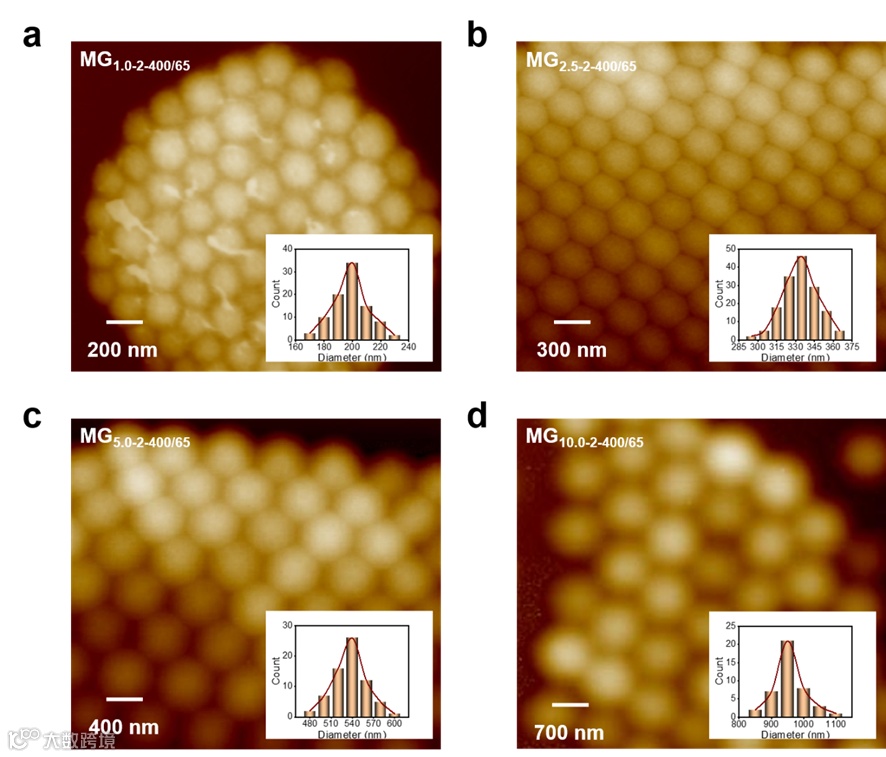 图4、微凝胶的原子力显微镜(AFM)图像。MG1.0-2-400/65(a),MG2.5-2-400/65(b),MG5.0-2-400/65(c)和MG10.0-2-400/65(d)。