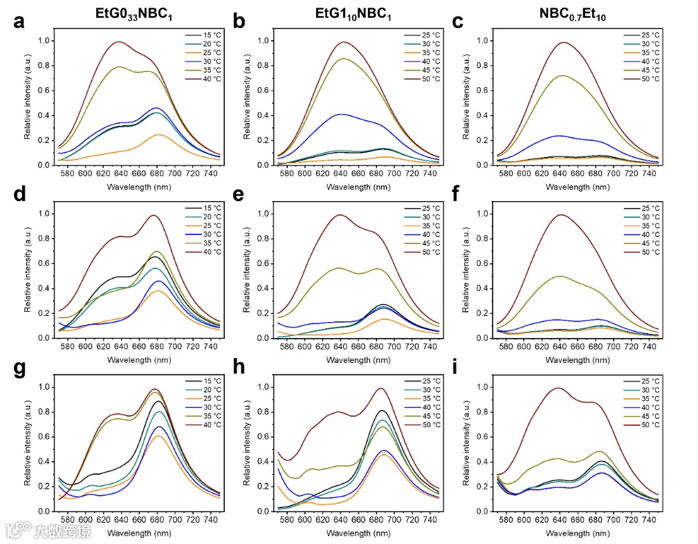 图7、荧光发射光谱与温度的关系。pH 4.0时的EtG033NBC1(a)、EtG110NBC1(b)和NBC0.7Et10(c),pH 3.0时的EtG033NBC1(d),EtG110NBC1(e)和NBC0.7Et10(f),pH 2.0时的EtG033NBC1(g),EtG110NBC1(h)和NBC0.7Et10(i)。