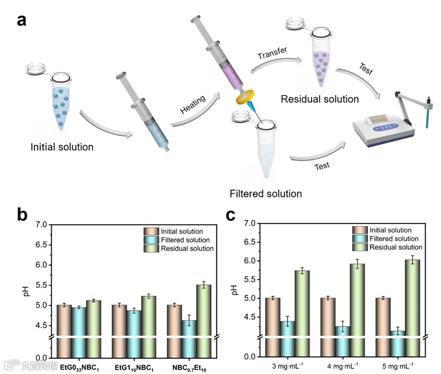 图8、温度诱导的相变过程中水溶液的pH变化(a)加热分离共聚物和微凝胶的示意图。(b)加热分离后共聚物和微凝胶溶液的pH值(浓度为2.0 mg∙mL-1)。(c)不同浓度的NBC0.7Et10溶液加热分离后的pH值的变化。