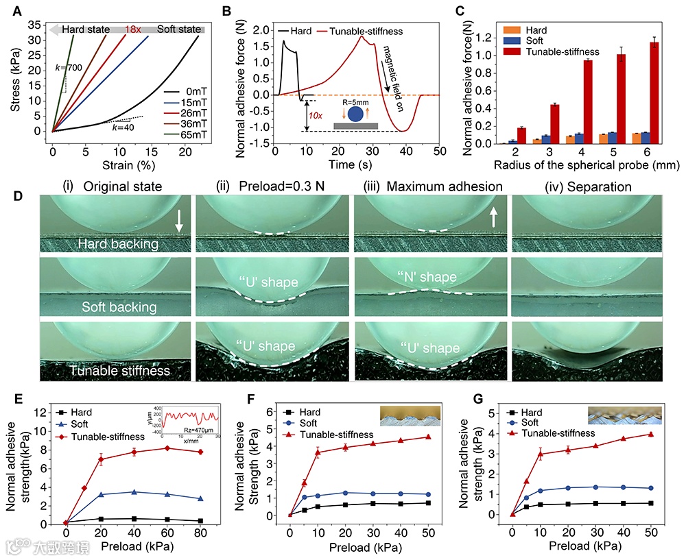 近日,西安交通大学邵金友、田洪淼团队提出了一种基于传感触发的变刚度智能粘附结构,不同于传统研究仅关注结构形态的仿生策略,该研究结合了生物体肌肉组织和传感神经的耦合功能,即基于界面接触状态的实时感知,通过磁流变效应实现对粘附结构刚度的主动调控,达到非平整表面自适应附着及其粘附/脱附快速切换的目的。当粘附结构接近目标表面时,结构刚度调整为软状态(移除磁场),以实现目标表面的共形接触;在拾取目标物体时切换到硬状态(施加磁场),以实现目标表面的高强度附着;在释放物体时再次恢复到软状态(移除磁场),以实现脱附行为,如图1所示。智能粘附结构的自适应变形和形状锁定能力,使其能够在甚少考虑表面形态或纹理的情况下对各类表面进行操作,已成功实水杯、高尔夫球、西红柿等日常生活常见非平整表面物体的拾取与释放。此外,归结于磁场的快速切换特性,智能粘附结构的响应时间可达毫秒级别(约100 ms),类比于哺乳动物骨骼肌的响应特性,突破了粘附结构在高节拍操作应用中的技术瓶颈。相关研究成果以“Sensing-triggered stiffness-tunable smart adhesives”为题发表《Science Advances》上,西安交通大学王铎睿博士为论文第一作者。