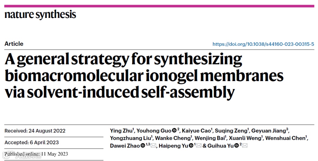 近日,东北林业大学生物质材料科学与技术教育部重点实验室于海鹏教授科研团队提出一种溶剂诱导组装及快速制备生物大分子离子凝胶膜的通用新策略,成果以“A general strategy for synthesizing biomacromolecular ionogel membranes via solvent-induced self-assembly”为题,发表于《Nature Synthesis》期刊。