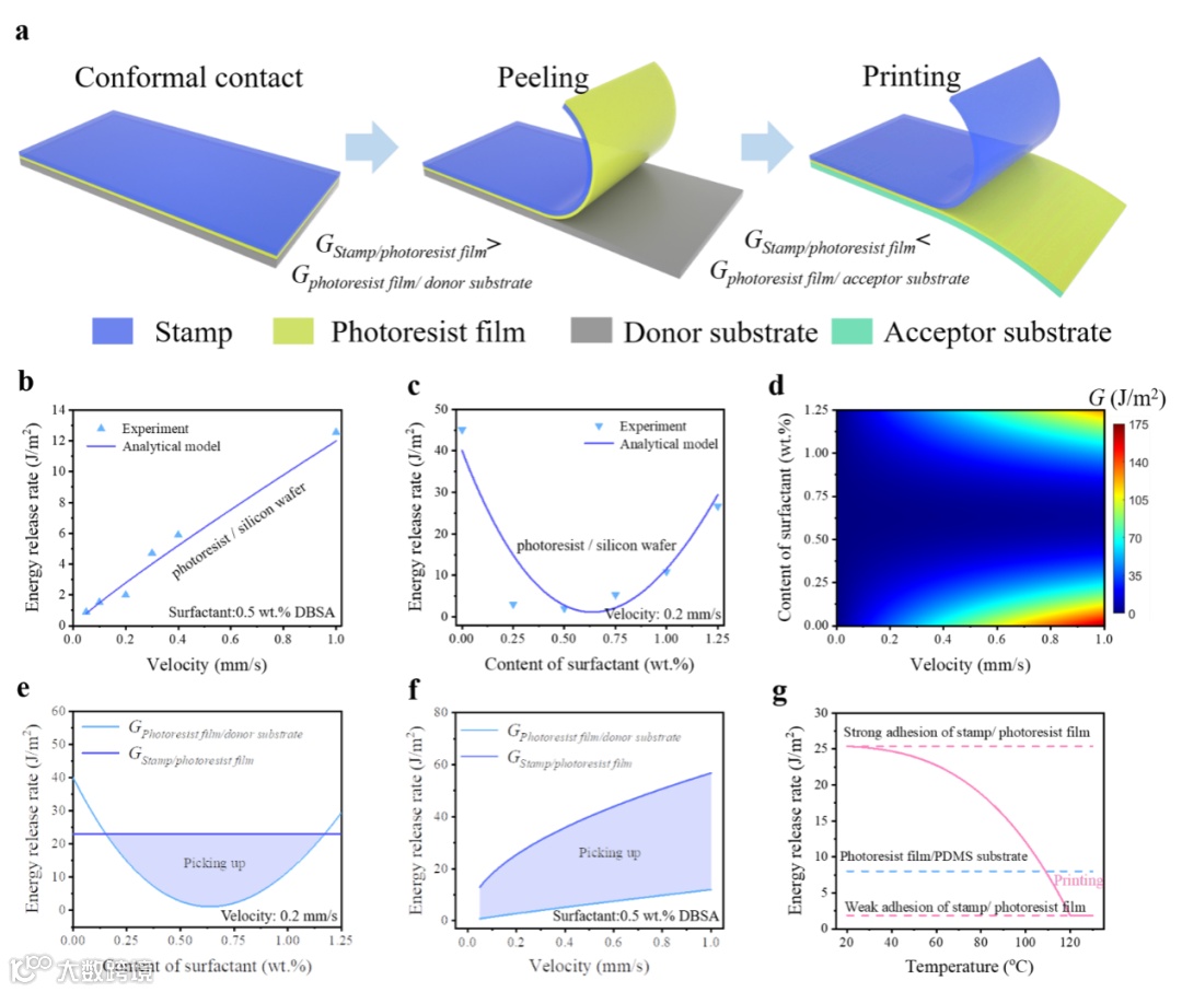 图3. “光刻胶全干法转印”工艺的力学理论模型和实验验证。