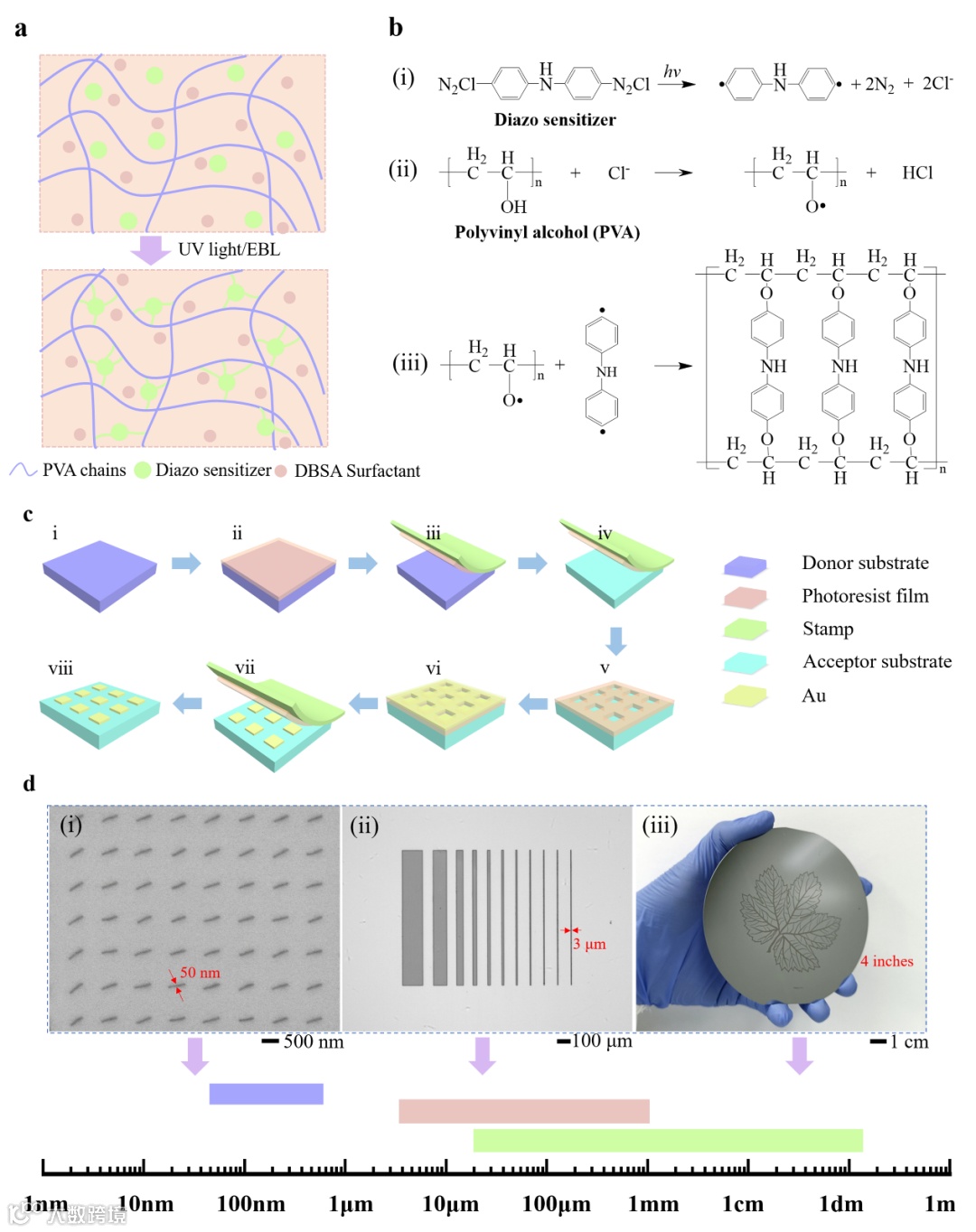 图1. 环保型可转印光刻胶材料的开发及工艺流程。所开发的光刻胶具有对紫外光(UV)和电子束(EBL)辐照的双重敏感性,可用于加工多尺度图案。在整个光刻工艺中不需要使用有毒、昂贵的有机溶剂和显影剂,通过纯水进行显影,绿色环保。