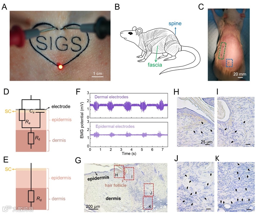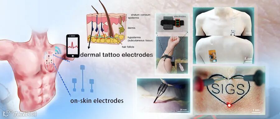 皮肤集成电子因其在个性化健康管理、通讯和人机交互等多领域的应用潜力而受到广泛关注。其中,“纹身电子”(表皮电子)泛指一种可直接贴在皮肤上的柔性贴片,具有临时纹身的轻松、舒适等特点。纹身,将墨水或染料颜料注入皮肤真皮层,是一种已普遍存在的身体修饰技术。迄今已报道的“纹身电子”大多以皮肤表面集成的形式呈现,而使用真皮纹身实现电生理信号的精确诊断是一种尚未探索的皮肤集成电子范式。