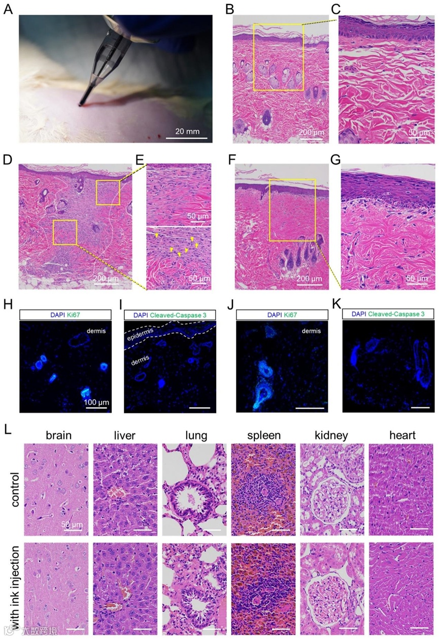 此外,研究团队首次利用纹身技术构筑出真皮纹身电极,实现了SD大鼠体内长达两周的EMG信号稳定记录。墨水注射14天后,SD大鼠皮肤的组织学横截面表明墨水在真皮层中保持最初注入的位置,而不改变皮肤组织结构。此外,连续记录皮肤表面外观表明,墨水注入两周后,角质层基本愈合并覆盖了导电通道。注射墨水的部位能够再生毛发,表明真皮纹身不会引起疤痕或非疤痕性脱发。在纹身注射和EMG记录后持续观察大鼠活动长达三个月,发现其与未经墨水注射的参考大鼠活动并无明显差异,进一步表明PPEL墨水的生物安全性。该工作将纹身电极的应用场景从表皮进一步拓展到皮下真皮层,为深层组织水平上的电子器件和生物组织通信开辟了新途径。
