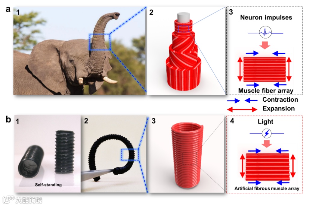 在象鼻中,肌肉纤维通过定向排列和缠绕,形成了象鼻的管状肌层。不同肌肉纤维取向(轴向、径向、圆周方向、螺旋取向)的多个肌肉层的复合,共同构成了象鼻肌肉层的三维管状结构(图2a)。通过神经信号激发特定纤维取向方向的肌肉层,可以可控地实现多种变形模式,包括伸长、弯曲、扭转等(图3),甚至实现多种变形模式组合的复杂变形模式。
