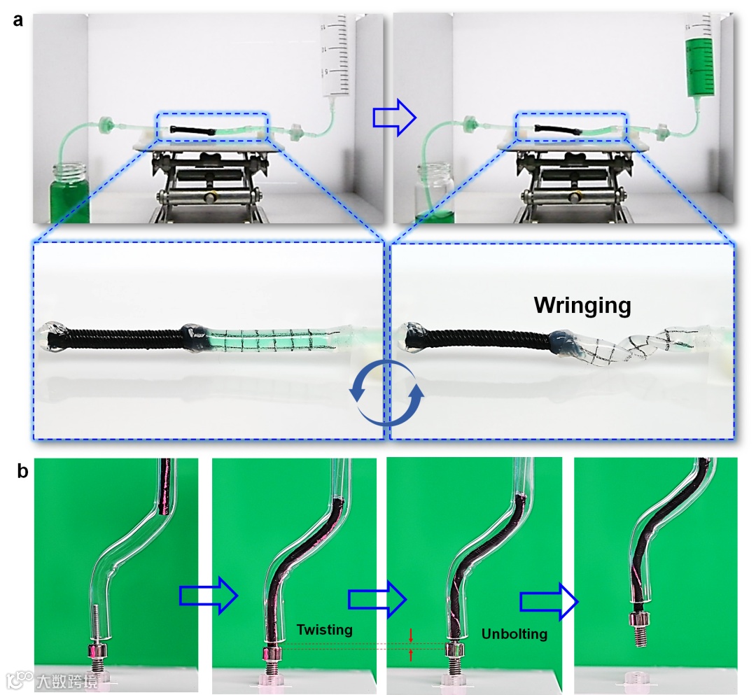 ) , V为在一个周期变形产生后管状执行器排出流体的体积,V0为管状执行器形变前的初始内腔体积),从而有效实现泵送功能。此外,研究人员从哺乳动物心脏利用独特的拧绞变形提高射血效率的原理中得到启发,利用管状执行器的扭转运动引发拧绞变形,放大流体排出率,开发出高泵送效率(η = 84%)的新型柔性泵(图6a)。