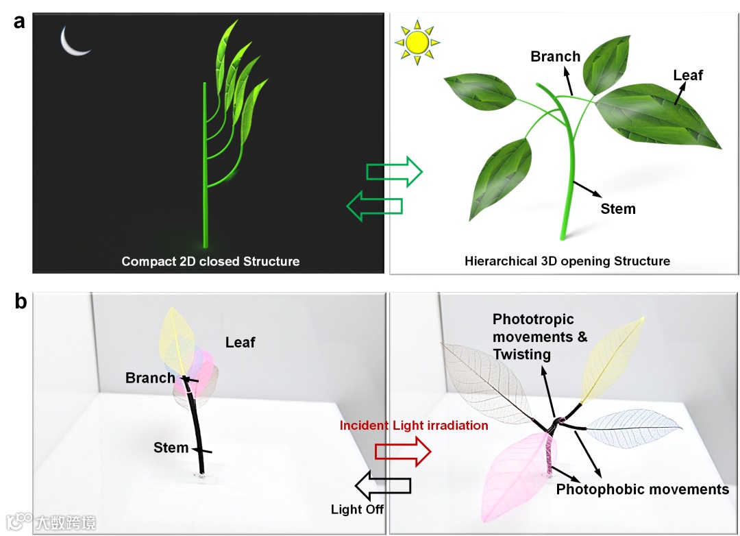 自然界中的植物具备对环境适应性的智能响应变形行为,智能高分子团队利用HAFMS-TSA创造出一种智能人造植物(图7)。这个智能植物可以像真实植物一样,根据光照条件做出自适应的动态三维结构自动转变。与自然界中植物的智能感光变形行为相似,智能人工植物同时具备厌光性(对光避免)、趋光性(对光追逐)和与光入射方向无关的变形行为。这使得智能人工植物可以根据外界光辐射条件的变化在紧凑的闭合2D状态和多级打开的3D状态之间实现可逆动态和自发转换。此外,智能人造植物还具有智能化的自我保护机制,处于弱光环境下时,它会自动展开和扩张,以增加光的吸收面积。当智能植物暴露在高强度光辐射时,植物的器官将自动变形使器官平面平行于光的入射方向,以减少被辐射面积。这与自然界中真实植物所表现出的自动避免高剂量太阳辐射伤害的自我保护智能非常相似。