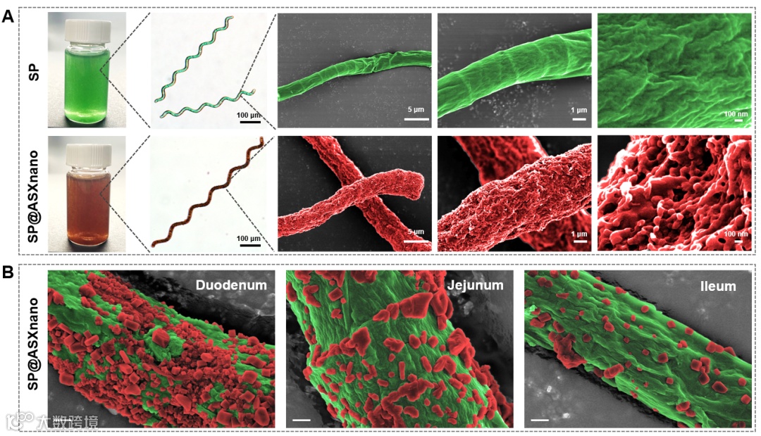 图2(A)SP吸附ASXnano前后的形貌;(B)SP@ASXnano口服后在十二指肠、空肠、回肠部位的形貌。