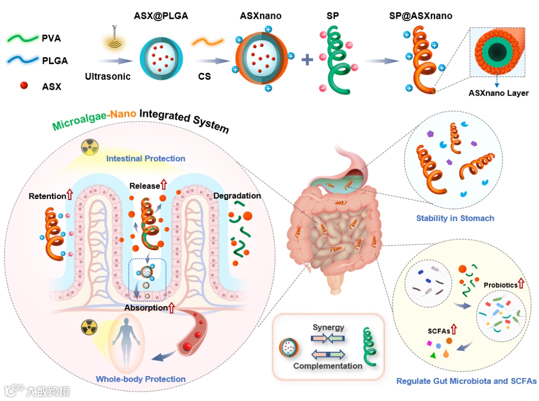 图1 微藻-纳米复合口服递送系统的合成步骤与主要作用机制。PVA,聚乙烯醇;PLGA,聚乳酸-羟基乙酸;ASX,虾青素;CS,壳聚糖;SP,螺旋藻;ROS,活性氧;SCFAs,短链脂肪酸。