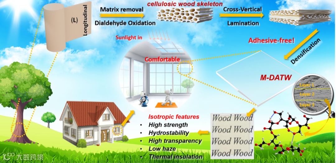 全球建筑物消耗的能源占总能源消耗量的20%至40%。例如,在一栋两层楼的房子中,30%的墙壁都被玻璃窗覆盖,而玻璃的热管理能力(导热系数较高)较差,导致高达60%的能量通过这些玻璃窗户损失。因此,先进的建筑材料在促进全球可持续发展方面受到了特别关注。木材来源于天然可再生资源,在机械支撑和热屏蔽方面是使用最广泛的建筑材料之一。近年来,以木材为原料,通过各种脱木质素和透明高分子聚合物浸渍处理可获得兼具高透光率及力学强度的透明木材(TW)。由于保留了木材天然的低导热性,这种透明木材是一种理想的节能透明材料。