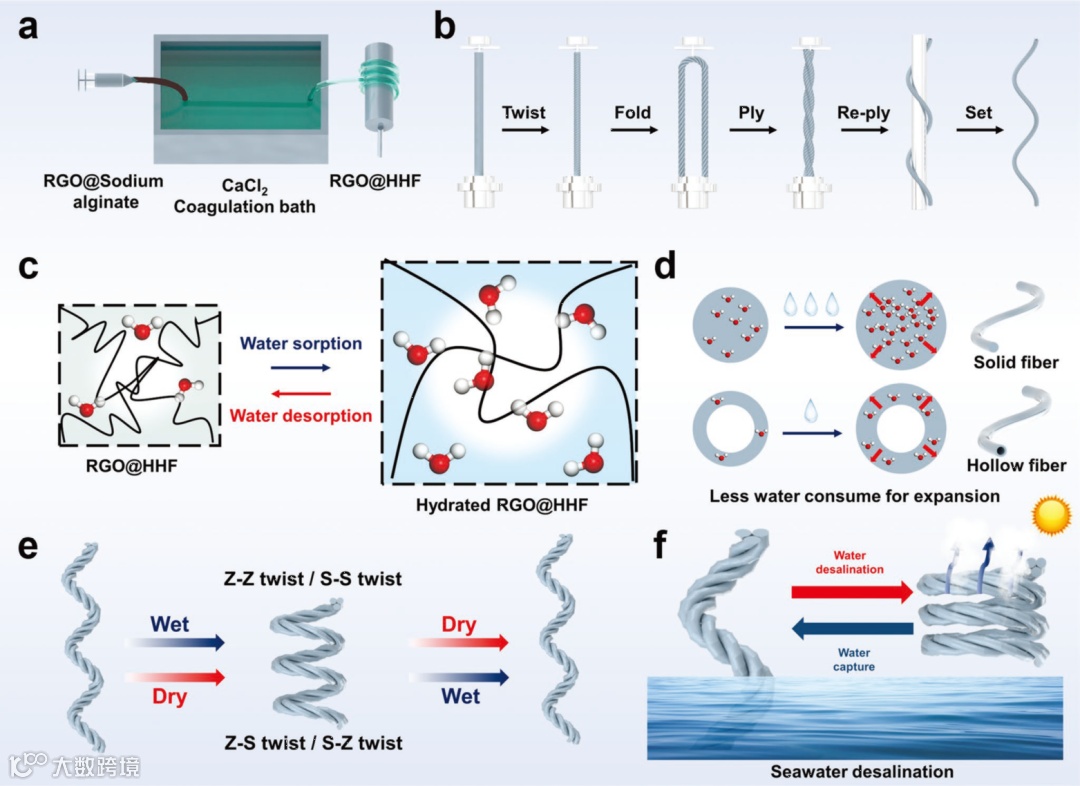 图1:制作工艺示意图: a) 湿纺和b) RGO@HHF的加捻工艺。c) RGO@HHF的变形机理。d)实心和中空纤维吸水时的膨胀行为。e)同手性(Z-Z, S-S扭转)和异手性(Z-S, S-Z扭转) RGO@HHF的响应行为示意图。f) RGO@HHF的海水淡化应用。