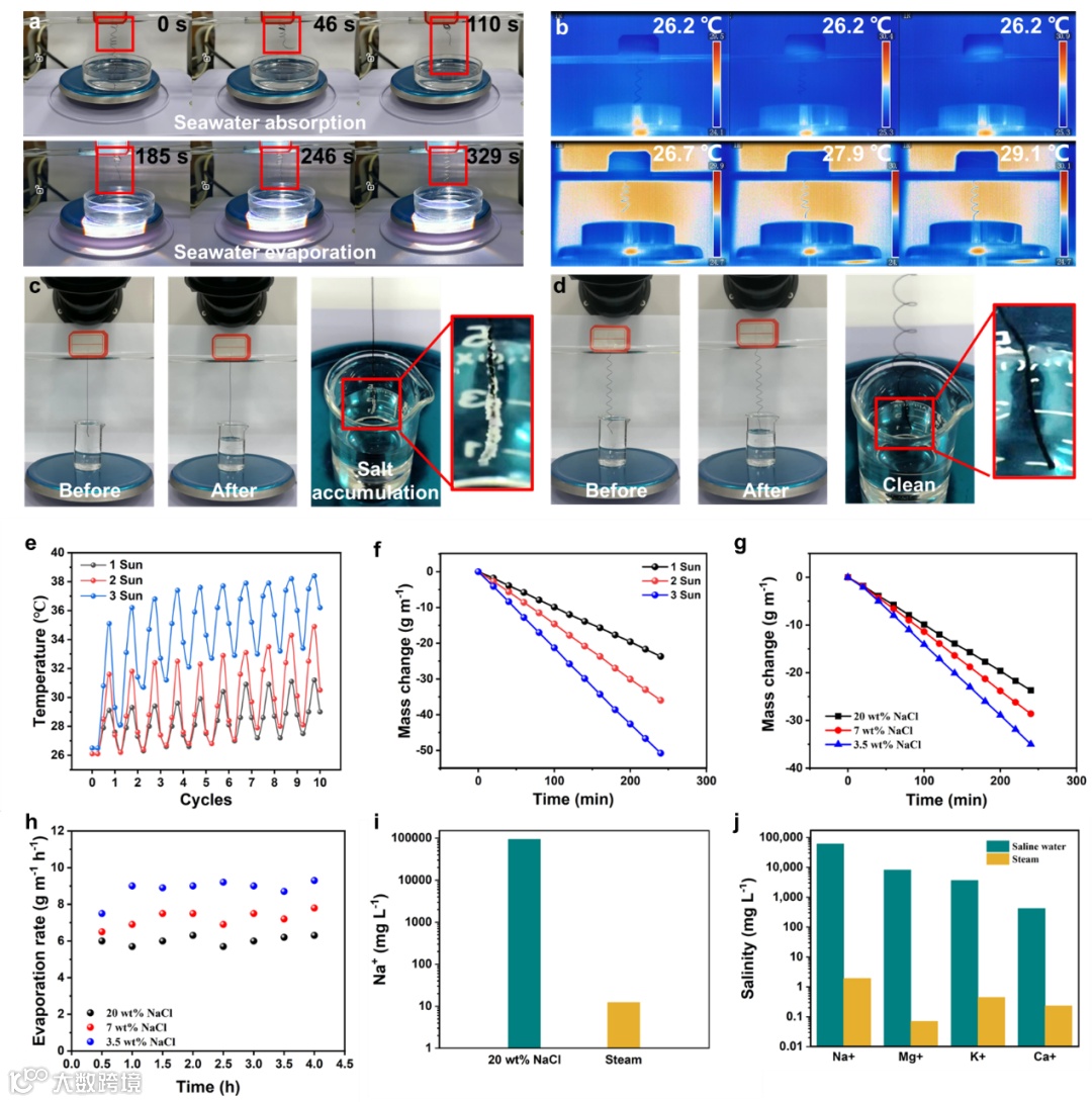 图3:a) 双加捻RGO@HHF的脱盐过程。b) 在20wt % NaCl溶液中脱盐过程中,一个太阳光强度照射下的RGO@HHF随时间变化的红外图像。c) 延时快照显示了原始RGO@HHF纤维和d)双加捻RGO@HHF纤维在脱盐过程中的盐积累。e) 20 wt% NaCl溶液中,双加捻RGO@HHF纤维在不同光照条件下的温度变化。f) 不同太阳光强度照射下水分随时间的变化。g) 双加捻RGO@HHF纤维在不同盐浓度下的重量变化情况。h) 双加捻RGO@HHF纤维在不同盐浓度下的蒸发速率。i, j) 原始盐水和收集到的冷凝蒸汽水在经过太阳热蒸发后的离子浓度。