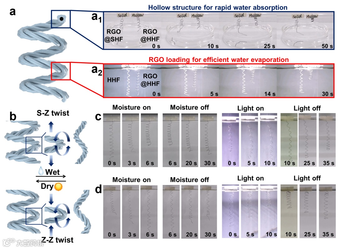 图2:a1)双加捻RGO@SHF(实心水凝胶纤维)和RGO@HHF(中空水凝胶纤维)在水刺激下的动态收缩过程。a2)双加捻HHF和RGO@HHF在光刺激下的动态收缩过程。b)同手性和异手性的双加捻RGO@HHF纤维的伸长/收缩驱动示意图。异手性(c)和同手性(d)双加捻纤维驱动器在水和光刺激下的动态收缩和伸长过程。