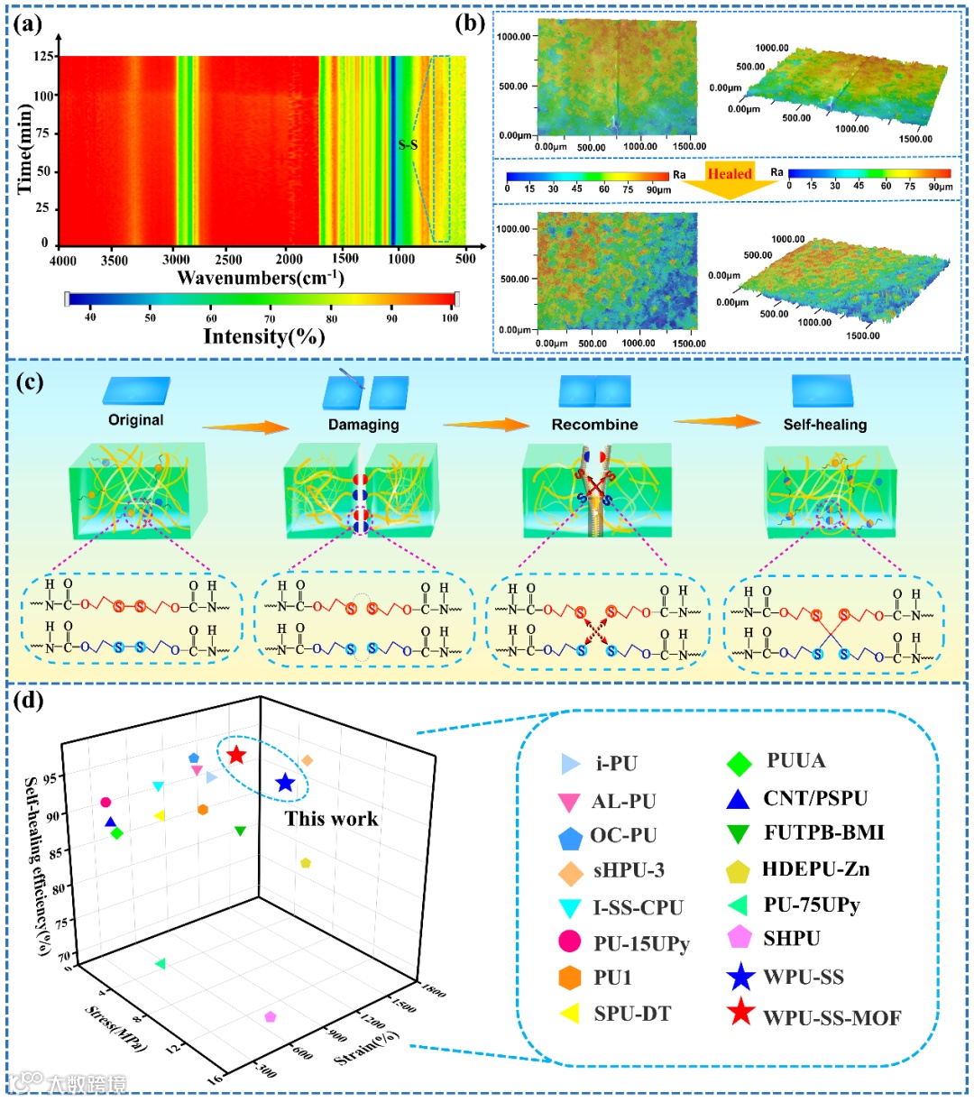 WPU-SS-MOF复合膜的自修复机理完全依赖于基材的S-S动态交换反应,MOF不具备任何自修复特性。由变温红外(ATR)和光学轮廓图像分析结果表明,S-S的链交换反应是一个动态的过程,且随着温度升高和降低S-S的重组反应活性会随之增强和减弱。同时,在热驱动的情况下S-S在体系中始终存在,且S-S在被破坏后不断的发生动态重组反应,促使断面逐渐由内致外实现完全自修复。