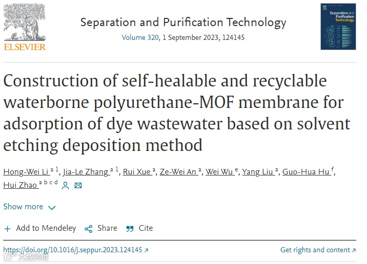 近日,广西大学王双飞,赵辉团队以具有优异自修复和耐溶剂性能的水性聚氨酯(WPU-SS)为基材,首次提出了一种简单的溶剂刻蚀沉积策略,设计并制备了一种三明治结构的WPU-SS-MOF复合膜。这种复合膜可以充分将MOF的活性位点暴露在聚合物基材表面,同时对阴离子染料甲基橙(MO)和刚果红(CR)具有很好的吸附能力。此外,首次将吸附膜赋予了自修复功能,使其在破坏并修复之后仍然可以保持MOF的结构稳定性和高效的吸附活性,从而赋予其优异的可循环使用性能。这种WPU-SS-MOF复合膜在染料废水处理领域具有一定的应用价值。这项成果以题为“Construction of self-healable and recyclable waterborne polyurethane-MOF membrane for adsorption of dye wastewater based on solvent etching deposition method”发表在了《Separation and Purification Technology》(中科院一区TOP,IF=9.136)上。文章以2020级硕士研究生李宏伟为第一作者,2022级硕士研究生张佳乐为共同第一作者,赵辉助理教授为通讯作者。