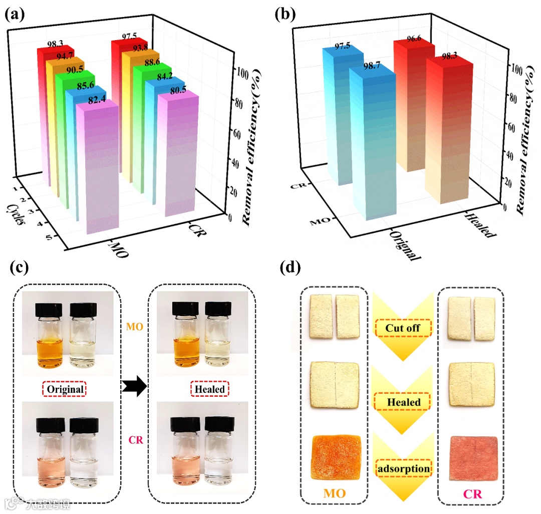 WPU-SS-MOF复合膜对MO和CR两种阴离子染料表现出良好的吸附效果和可循环使用性能。在5次吸附-脱附循环后,对MO和CR的吸附率仍分别可达82.4%和80.5%。同时,破坏修复后的吸附膜对MO和CR的吸附率分别为98.3%和96.6%,与原始试样几乎保持一致。