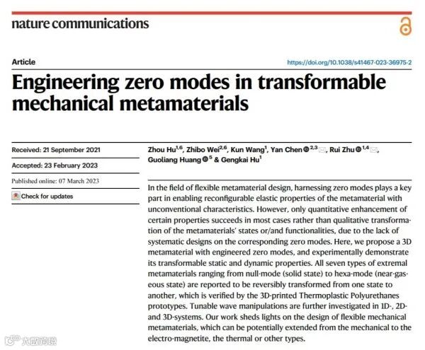 该成果以Engineering Zero Modes in Transformable Mechanical Metamaterials为题于2023年3月7日在线发表于国际权威期刊《自然·通讯》(Nature Communications)。论文共同通讯作者为天津大学陈焱教授、北京理工大学朱睿教授,共同第一作者为北京理工大学博士生胡洲、天津大学博士生魏志波。