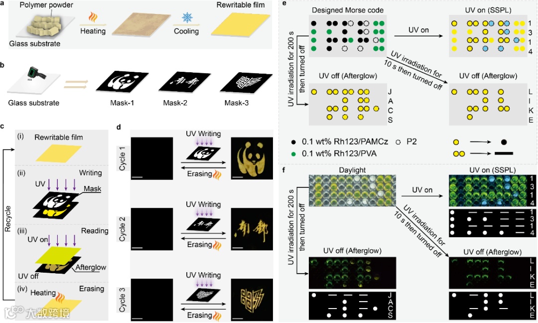由于此类材料独特的光活化特性,作者探索了其在无油墨光打印,脉宽指示器以及“激发时间”依赖的莫尔斯码等领域的应用(图3)。