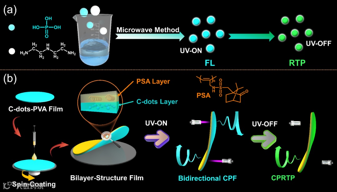 图1. (a)室温磷光碳点的制备和(b)具有CPF与CPRTP性能的碳点/手性螺旋聚合物复合膜的制备