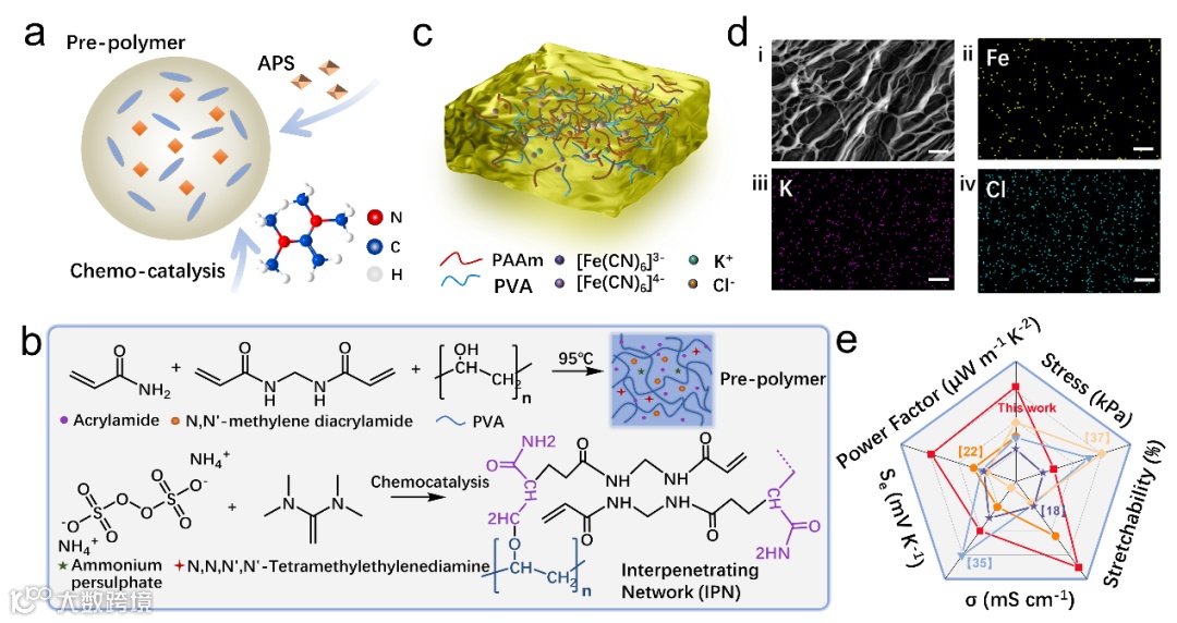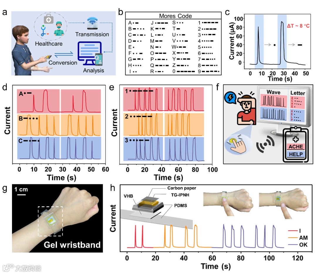 近期,太原理工大学信息与计算机学院张虎林教授团队开发了一种由PAAm/PVA制备的互穿网络热电水凝胶(TG-IPNH),表现出良好的机械性能和热电性能。单个器件在10 K温差下能达到124 μA 的短路电流。基于凝胶温度敏感性的热电响应,结合摩斯电码设计得到一个实现无源信息转换的凝胶腕带,可以为失语症患者提供实施的帮助。该项研究为语言障碍人群沟通提供了一种新的可能,尤其是在智能医疗与紧急救助方面。该工作以“Self-powered information conversion based on thermogalvanic hydrogel with interpenetrating networks for nursing aphasic patients”为题发表在《Nano Energy》(IF=19)。文章第一作者是太原理工大学硕士研究生李嘉宁,通讯作者为张虎林教授,该研究得到了山西省自然科学基金以及山西省科技合作与交流专项的支持。