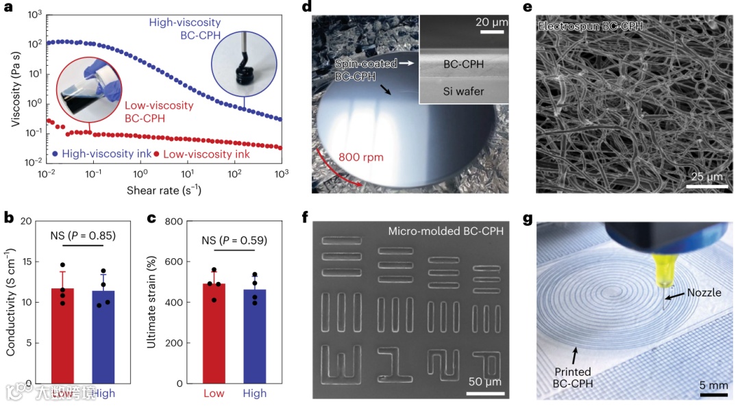 作者通过PEDOT:PSS-PU的固含量可有效调控前驱体溶液的粘度,进而可以制备出满足多种先进制造技术的BC-CPH墨水,如旋涂、静电纺丝、光刻和3D打印等(图 3)。通过不同加工技术获得的BC-CPH性能差异较小(图 3b)。流变学可控性使得BC-CPH具有良好的应用前景,并为制造具有复杂结构和高分辨率的BC-CPH器件提供了可能性。