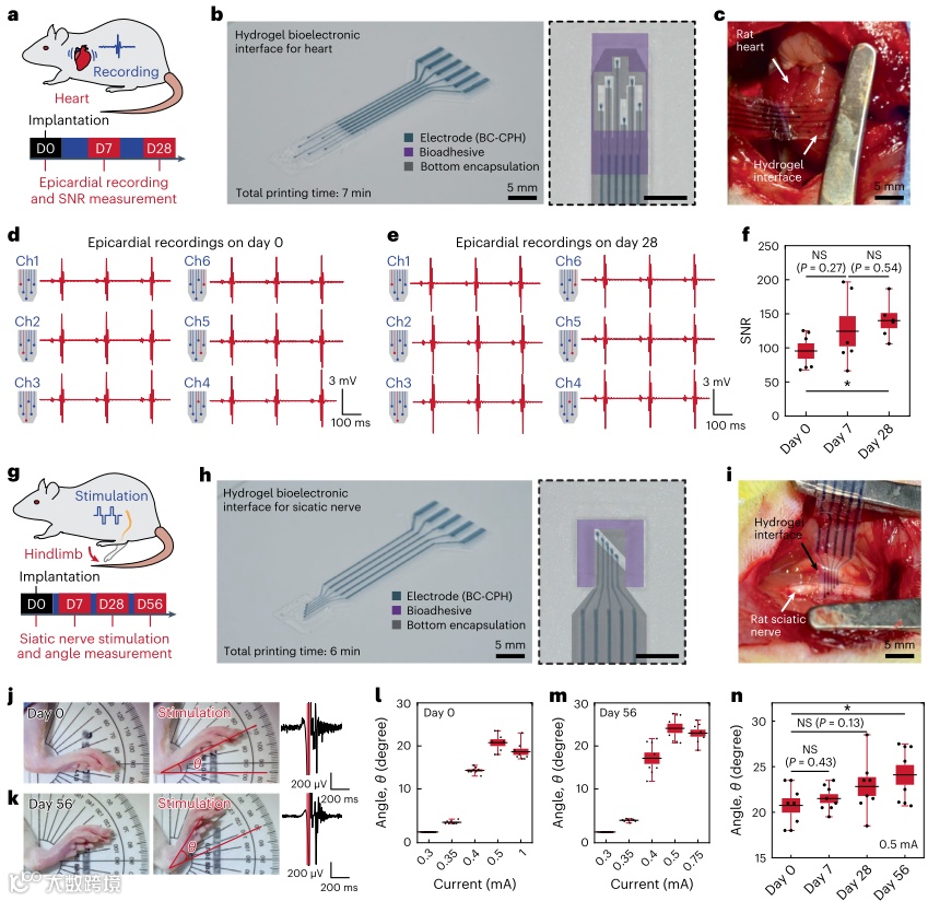该团队进行了一系列活体研究,评估了植入式全水凝胶生物电极的生物相容性、电生理记录和刺激效果及长期稳定性。结果显示,这些生物电极能够持续、精确记录大鼠活体的心电信号,稳定性优异,且电生理信号随植入时间增长而增强(图 5)。此外,植入式全水凝胶生物电极还可以用于稳定长期的电刺激应用,通过微脉冲刺激坐骨神经和脊髓可以实现相关肌肉和四肢的运动控制,在2个月内稳定性优异(图 5)。