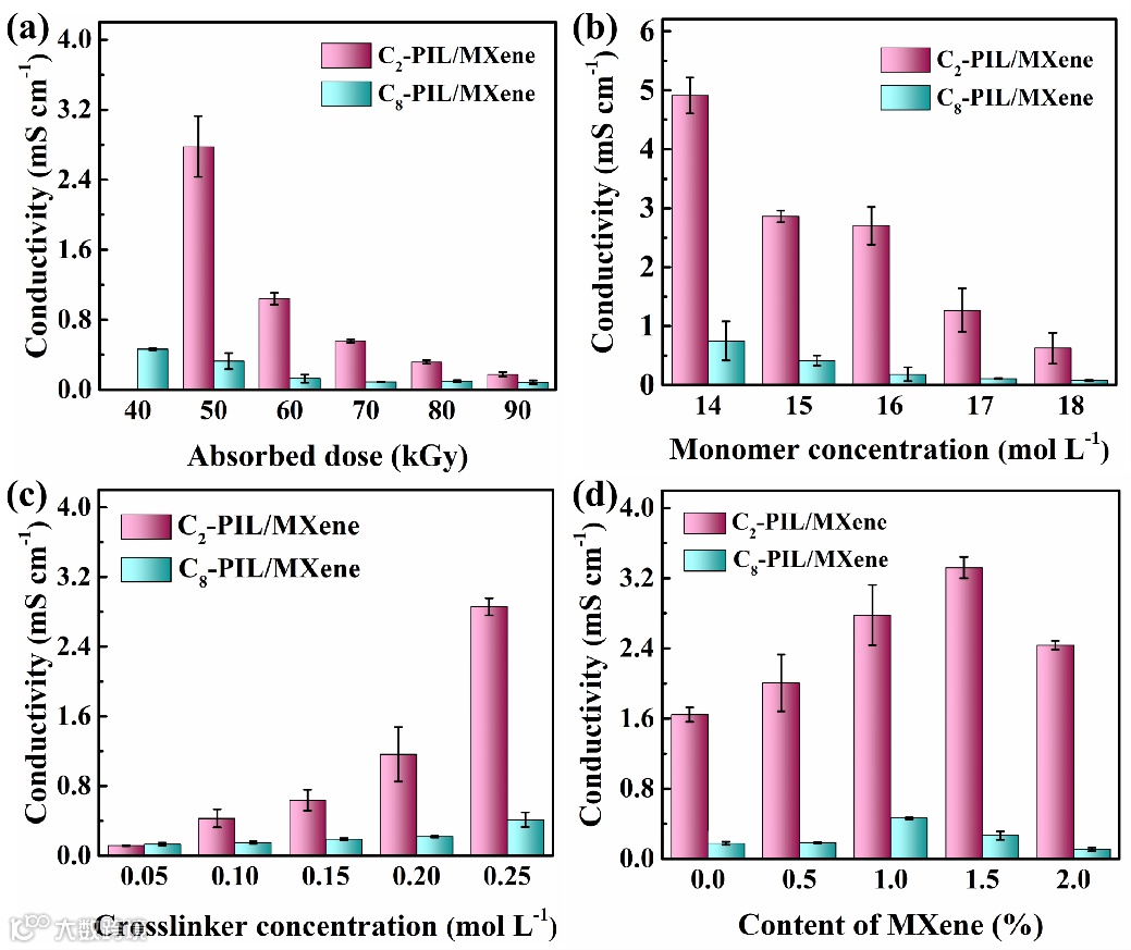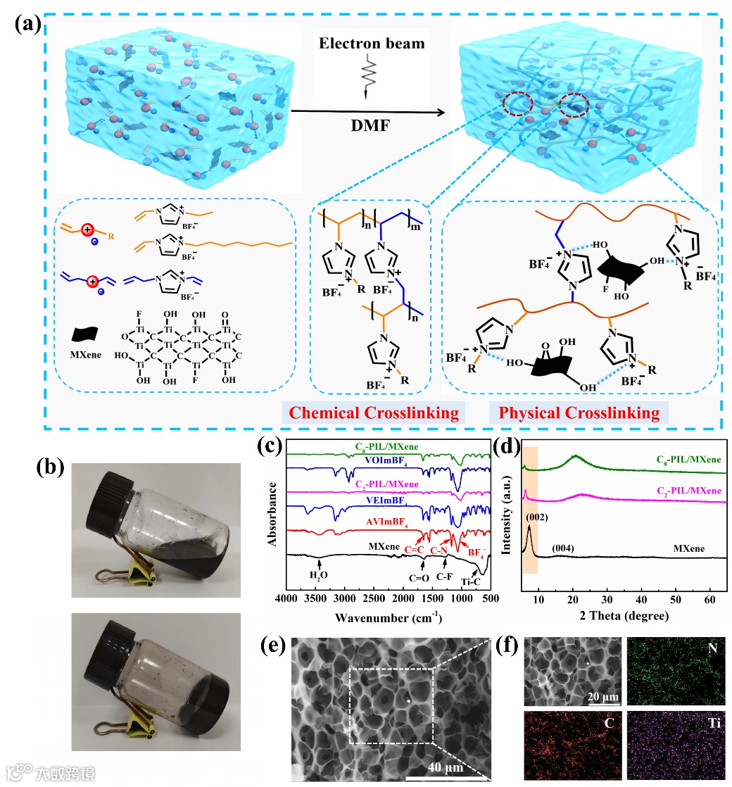 1.针对上述问题,本工作提出了增加凝胶中的非共价作用以及在交联结构中引入共价/非共价协同作用机制来提高和改善凝胶的机械性能,稳定性和导电性的思路。本工作使用含有-C=C-双键的咪唑类ILs分别作为单体和交联剂,Ti3C2Tx MXene同时作为物理“交联剂”和导电纳米填料,首次采用电离辐射技术诱导离子液体单体在有机溶剂中发生辐射聚合/交联,一步法原位制备出一系列兼具共价和非共价交联结构的双交联新型聚(离子液体)/MXene(Cn-PIL/MXene)凝胶。
