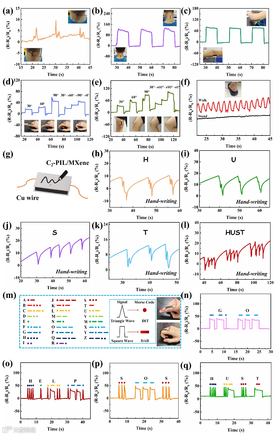 3.基于C2-PIL/MXene凝胶的多功能柔性应变传感器,能够实时快速的响应人体的各种活动,识别书写笔画,实现信息的加密传输,在柔性智能可穿戴设备中显示出巨大的应用潜力。
