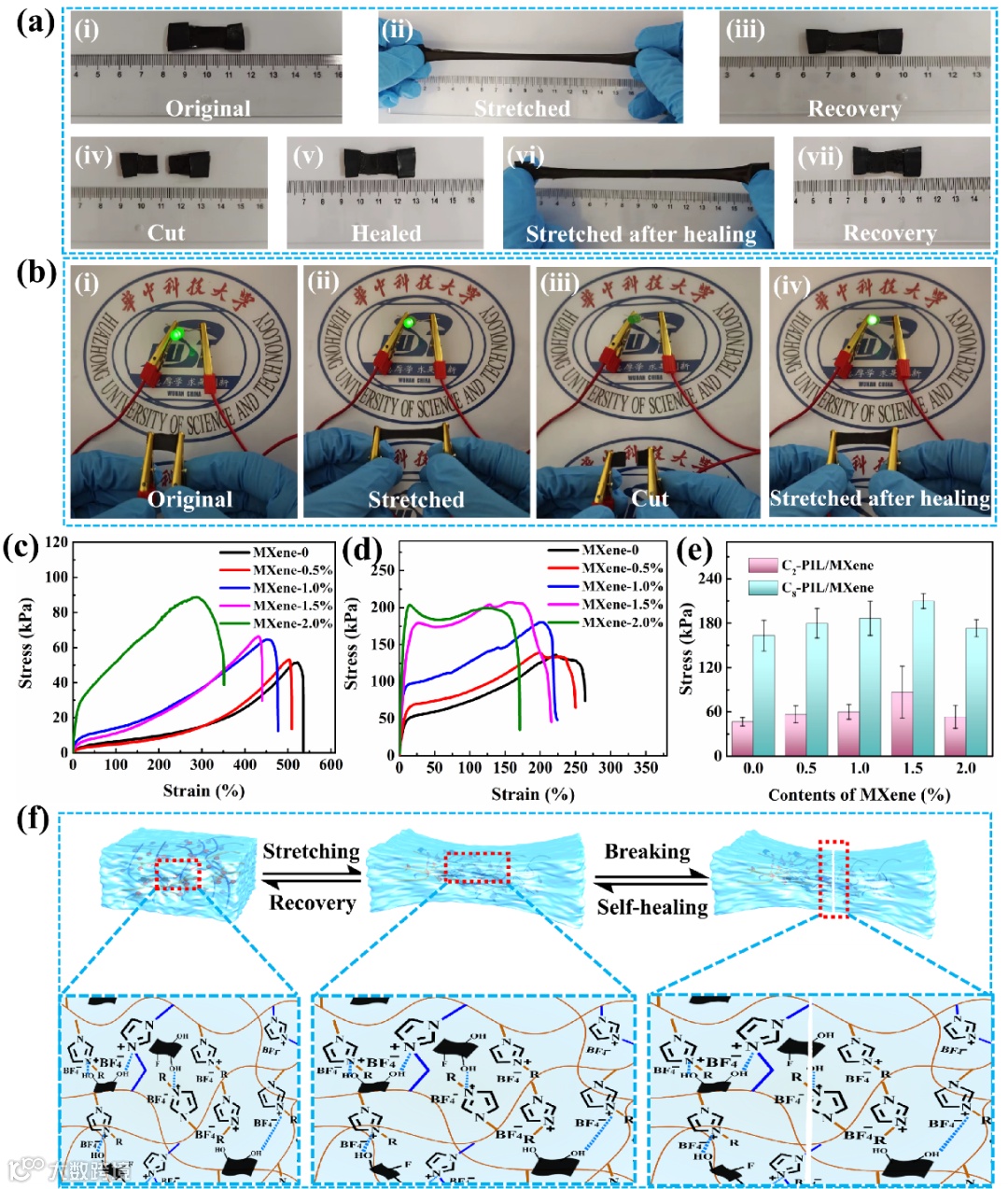 图4. Cn-PIL/MXene凝胶的机械性能和自愈合性能