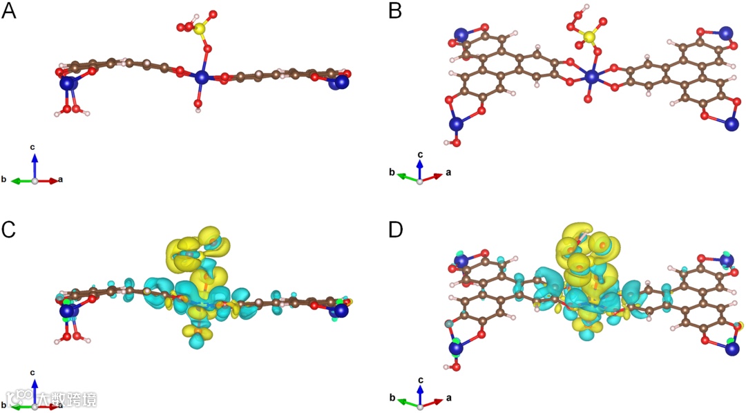 图5(A和B)PMS分子吸附在Co-CAT上的DFT模型示意图,和(C和D)PMS吸附在Co-CAT上的差分电荷密度示意图,黄色区域表示富电子区,绿色区域表示贫电子区。原子颜色:Co,蓝色;O,红色;C,棕色;S,黄色;H,白色