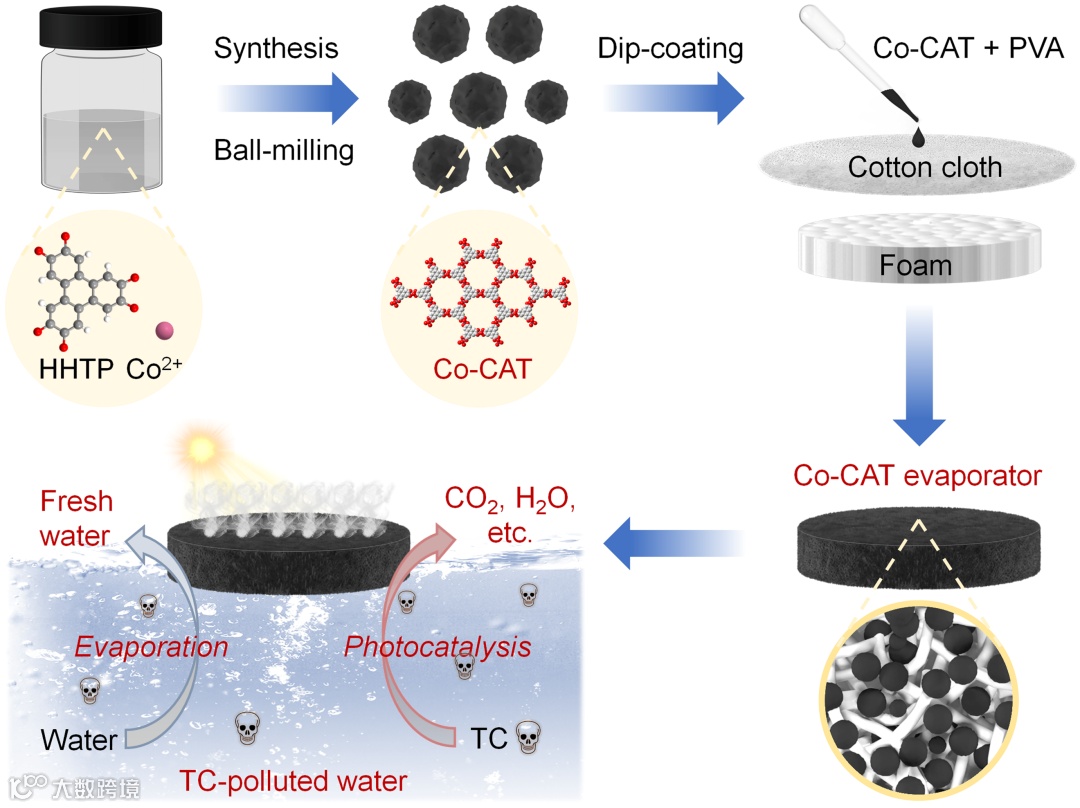 在最近的工作中(Applied Catalysis B: Environmental 337 (2023) 123001,影响因子为24.319),他们制备了一种钴基MOF(即Co-CAT),将其涂覆在棉布上并以泡沫为基底,得到双功能蒸发器用于太阳能界面蒸发和AOP催化降解TC(图1)。Co-CAT是通过配体HHTP(C18H12O6)和金属盐醋酸钴在水溶液中加热反应形成的,将洗涤和干燥后的Co-CAT经过球磨成粉末。将Co-CAT粉末涂覆在棉布上,并以聚苯乙烯(PS)泡沫为漂浮基体,制备得到Co-CAT蒸发器。