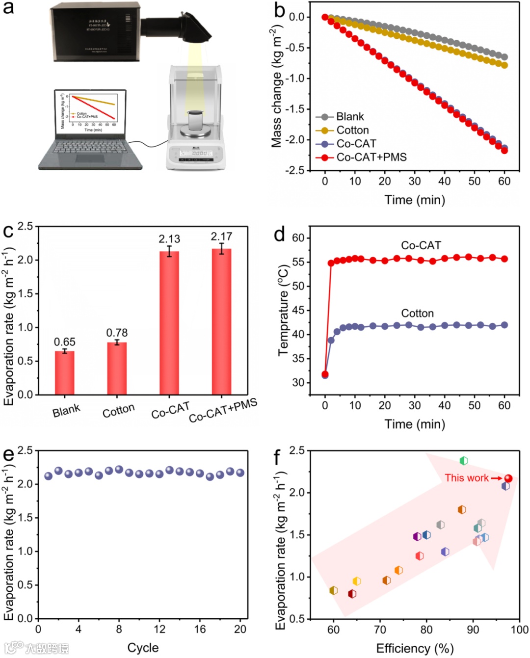 测试Co-CAT蒸发器的光热水蒸发性能(图3)。光热蒸发测试装置由太阳光模拟器和电子天平组成。在1 kW m−2光强照射下,TC溶液的质量损失与时间呈线性关系。实验结果表明,使用Co-CAT蒸发器和进一步加入PMS时的水蒸发速率分别为2.13 kg m−2 h−1和2.17 kg m−2 h−1,明显高于不使用蒸发器时的水蒸发速率(0.65 kg m−2 h−1)和使用棉布(Cotton)蒸发器时的水蒸发速率(0.78 kg m−2 h−1)。Co-CAT蒸发器在20次蒸发测试中,水蒸发速率始终保持在2.1 kg m−2 h−1以上,表明Co-CAT蒸发器具有良好的循环使用稳定性。此外,Co-CAT蒸发器的光-蒸汽转换效率为97.6%,和一些已报道的蒸发器相比具有突出的光热蒸发性能。