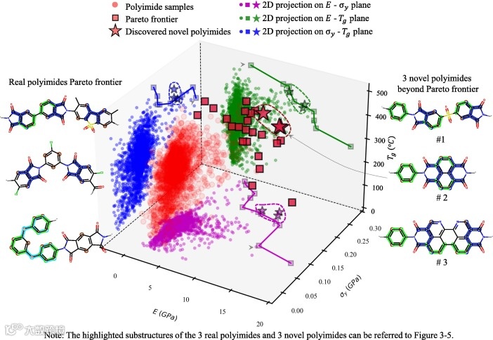 在检查所有假想聚酰亚胺材料的机器学习预测的屈服强度、杨氏模型和玻璃转化温度时,其中一些可以被称为Pareto frontiers,这意味着在不降低其他性质的情况下无法改善其中任何一个性质。这组假设聚酰亚胺材料的Pareto frontiers定义了三个热力学特性(屈服强度、杨氏模型和玻璃转化温度)的边界。在假想的聚酰亚胺材料的Pareto frontiers中,选择了三种表现最佳的假想聚酰亚胺材料(同时具有高屈服强度、杨氏模型和玻璃转化温度)。类似地,基于所有真实聚酰亚胺材料的三个热力学特性,可以确定一个新的Pareto frontiers,它定义了真实聚酰亚胺材料的性能边界(如图2所示)。图2还展示了所有真实聚酰亚胺材料在三个平面上的投影。在每个平面上,二维Pareto frontiers更加直观,杨氏模型-玻璃转化温度、杨氏模型-屈服强度和屈服强度-玻璃转化温度的组合是三维设计空间中的特殊情况之一。当从800万个假想的聚酰亚胺材料中发现的三种性能最佳的新型聚酰亚胺材料(用红色星号表示),发现这些假想的聚酰亚胺材料超出了真实聚酰亚胺材料的Pareto frontiers,表明其性能更为优越。它们的化学结构显示在图2的右侧。与图2左侧Pareto边界附近的三种真实聚酰亚胺的化学结构相比,发现共同的结构特征,如主链骨架中的芳香环和硫和氧之间的磺酰双键。这种相似性表明了该机器学习模型在抓取关键结构的精确性。此外,影响聚酰亚胺热力学性能的重要亚结构包含在这些发现的新型聚酰亚胺中。它们位于真实聚酰亚胺设计空间的Pareto frontiers之外,表明高性能聚酰亚胺试验合成的可行性。如果基于更多的热力学性能,7个性能属性的雷达图展示了三个高性能的假想的聚酰亚胺。就它们在t-SNE化学空间中的位置而言,这三种新型聚酰亚胺接近真实聚酰亚胺。更重要是,这三个假想的聚酰亚胺具有超越其他真实聚酰亚胺材料的热力学性能。