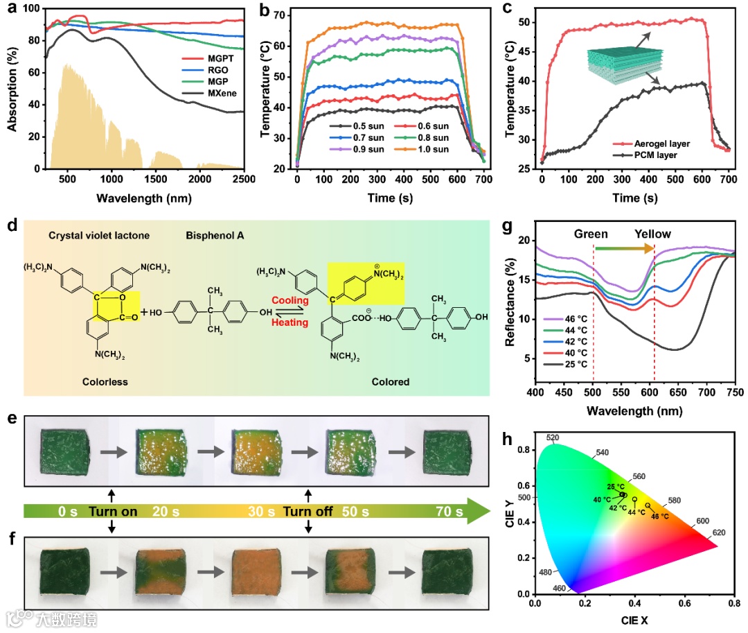 图4. MGPT复合材料的光热转换及热致变色性能。