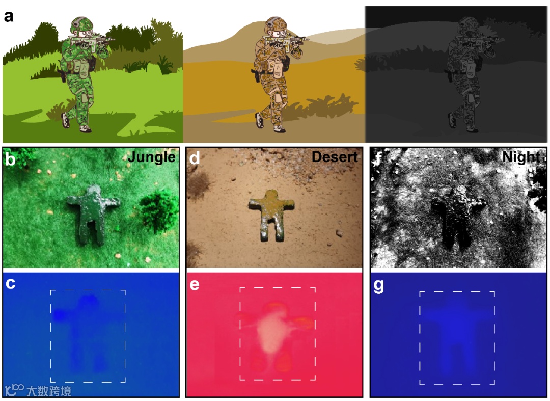图6. MGPT复合材料在模拟丛林和沙漠场景中的红外/可见光同步伪装展示。