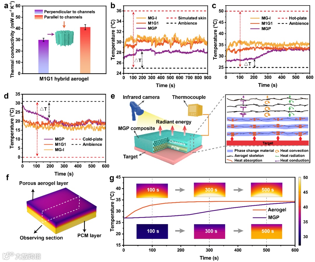 近期,北京化工大学于中振教授和杨冬芝教授团队通过将各向异性的MXene/还原氧化石墨烯(RGO)杂化气凝胶与正十八烷相变材料以及热致变色油墨相结合,制备了一种集隔热,吸热,光/电热转换和热致变色于一体的三层复合材料(MGPT),实现了丛林和沙漠场景中同步的红外和可见光伪装。该复合材料通过协同各向异性气凝胶的隔热和正十八烷相变材料的吸热作用,抑制目标向环境辐射热量,最大限度地减少可探测的辐射能差,使目标与其环境的红外图像相融合。此外,源于RGO和MXene的光/电热转换效应不仅能够提高复合材料的表面温度使其与背景的高温相匹配,同时能够驱动颜色变化以适应周围环境,实现红外和可见光波段的双重伪装。例如,在夜间,复合材料利用隔热和吸热作用减小目标表面与其背景之间的辐射能量差,从而实现目标在红外波段的不可见性。在丛林中,除了红外隐身外,绿色的外观可以使目标在白天与周围环境难以区分。当移动到灼热的沙漠后,在太阳光加热和热致变色的帮助下,复合材料自适应地提高表面温度,同时伴随着从绿色到黄色的颜色变化,将目标隐藏于环境的红外图像和沙土背景中。这项研究为设计用于对抗复杂场景下多频段监测的具有自适应和可调控的一体化伪装材料提供了有前途的策略。