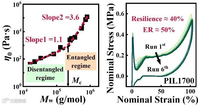 图1 聚离子液体粘度标度关系及循环拉伸-回复性能