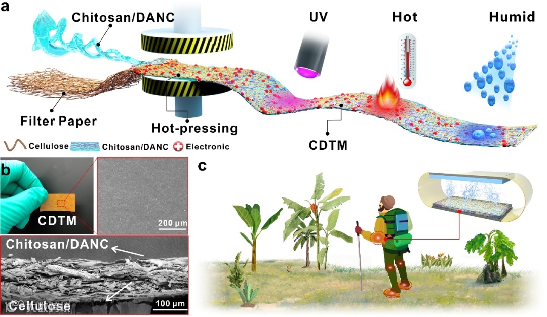针对该问题,王双飞院士团队通过将醛基纤维素纳米晶(DANC)和壳聚糖结合,制备了具有环境适应性和稳定结构的纤维素基复合材料。研究发现,在99%相对湿度下,该摩擦电材料的开路电压保留率提高了5倍,在100°C时仅有2%的开路电压变化率,表现出优异的抗环境干扰性能。这项成果以 “Cellulosic triboelectric materials for stable energy harvesting from hot and humid conditions” 为题发表在《Nano Energy》上。博士后高聪为第一作者,聂双喜教授、覃程荣教授、Pedram Fatehi教授为通讯作者。