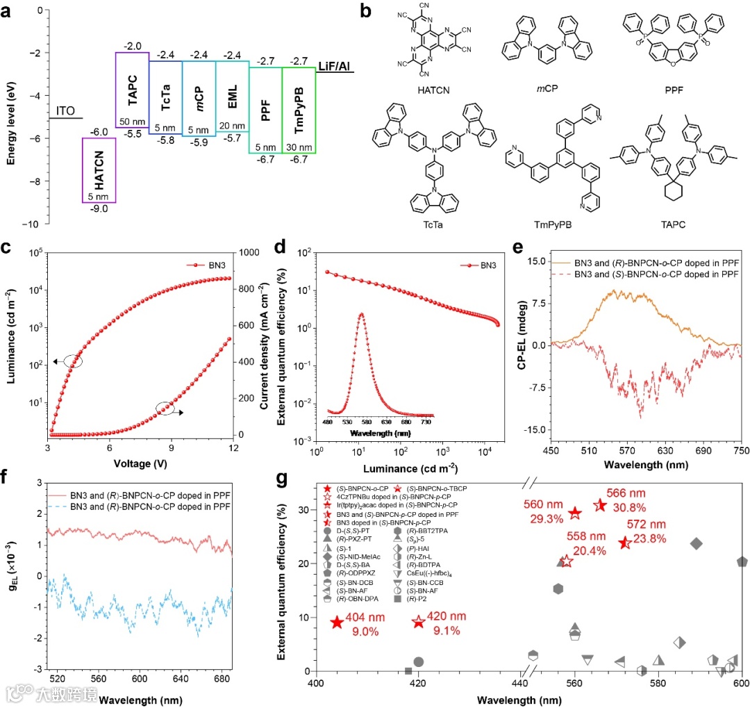 该工作首先开发了一系列高性能近紫外圆偏振发光材料,这些材料不仅具有良好的热稳定性,优异的光致发光效率,还能够通过高能级反向系间窜越过程来提高激子利用率。基于此类材料制备的CP-OLED表现出目前近紫外CP-OLED最好的性能,外量子效率高达9.0%(@404 nm)和9.1%(@420 nm),电致发光不对称因子(gEL)达到3.59 × 10‒3,同时表现出极好的器件稳定性。以所开发的近紫外圆偏振发光材料作为主体材料,将非手性商用磷光材料,热活化延迟荧光(TADF)材料和具有多重共振性质的(MR)TADF材料作为发光客体掺杂其中,制备了相应光色目前报道性质最好的CP-OLED。其中,器件外量子效率高达29.3%(@560 nm),最大亮度高达209400 cd m‒2,功率效率高达120.1 lm W‒1,gEL高达2.87 × 10-3。此外,基于MR-TADF材料的CP-OLED的半峰宽为44 nm,表现出很高的发光色纯度。随后利用近紫外圆偏振有机发光材料敏化MR-TADF材料,实现了外量子效率高达30.8%(@566 nm),半峰宽为45 nm的高效率高色纯度CP-OLED。对多种非手性商用发光材料的普适性表明此构筑CP-OLED策略具有潜在商用价值,为构建高效CP-OLED提供了一种新的思路和方法。