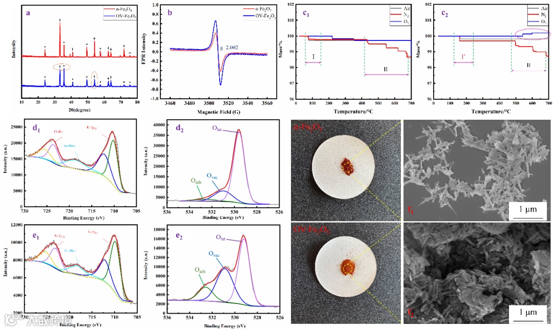 图2 (1) α-Fe2O3和(2) OV-Fe2O3的 (a) XRD; (b) EPR; (c) TGA; (d) XPS分析与 (e) SEM形貌。